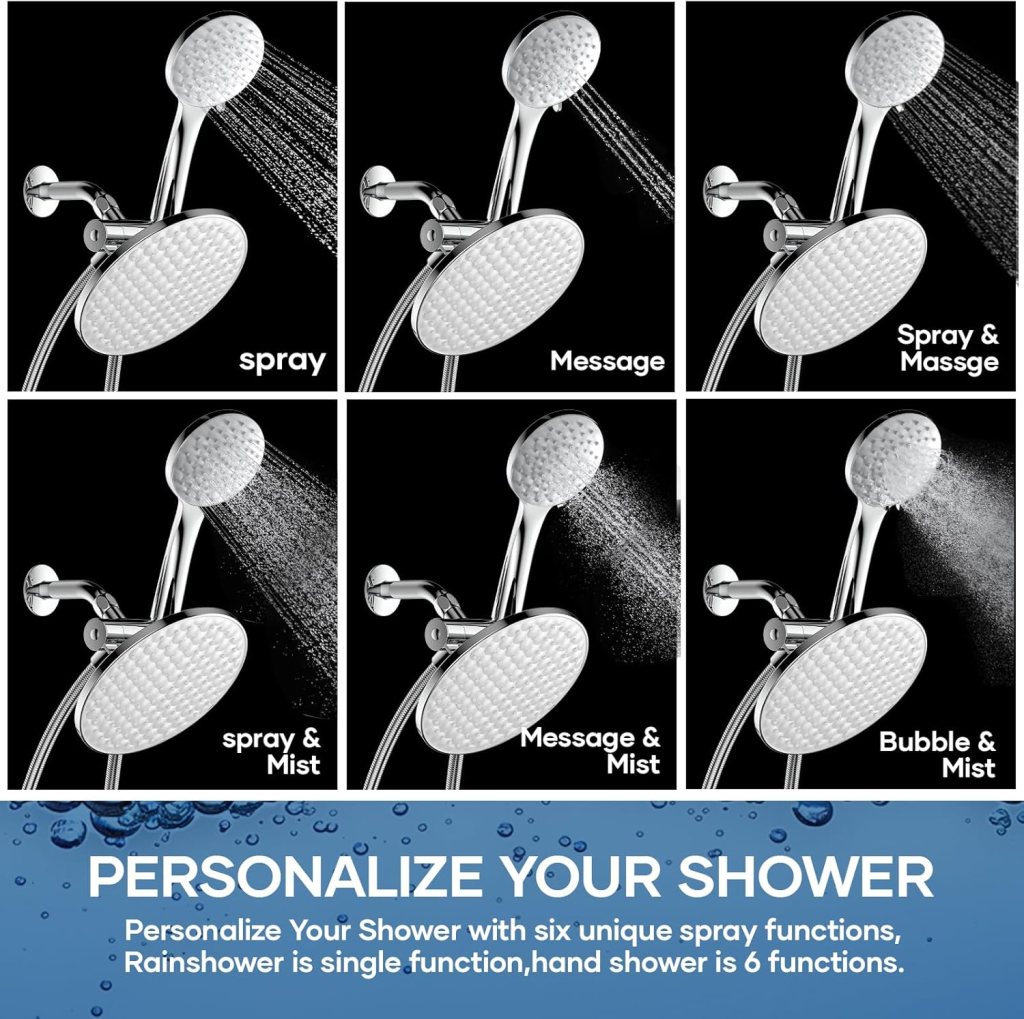 8.6 inch High Pressure 3-Way Shower Heads Combo, Pulsating Rainfall Shower Head, 6-Settings Dual Shower Head with Handheld Hose 6ft Chrome. Get it here