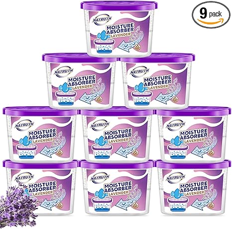 NATRUTH Moisture Absorbers with Lavender Scent,9-Pack Portable Closet Dehumidifier, Odor Eliminator Absorber Bucket, Unscented Humidity Absorber,Cleaner Air Dehumidifier for Closet,Bathrooms. Get it here