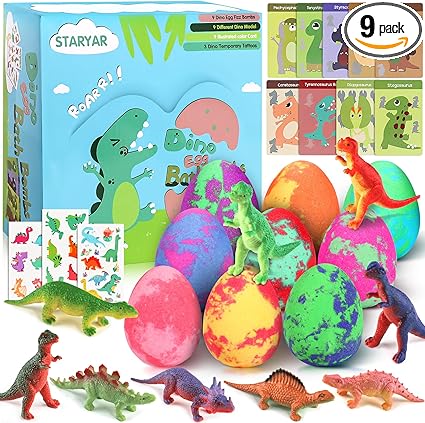 Bath Bombs for Kids with Surprise Toys Inside – 9 Pack Organic Dinosaur Bath Bombs Gift Set, Bubble Bath Fizzes, Dinosaur Toys for Kids 3 – 9 Years, Stocking Stuffers for Kids. Get it here